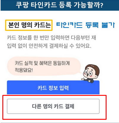 쿠팡에서 타인 명의의 카드로 결제가 가능하지만, 타인 명의 카드를 계정에 등록하는 것은 허용되지가 않습니다.