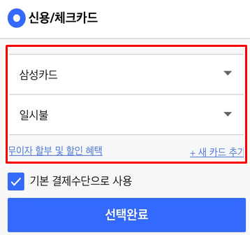 그 후 결제 수단을 변경해주시면 되는데, 카드명을 해제하시고 원하는 카드사를 설정해주세요. 그 다음 결제하기 기능을 통해서 다른 카드로 결제를 완료해주시면 타인 카드로 결제가 완료됩니다.