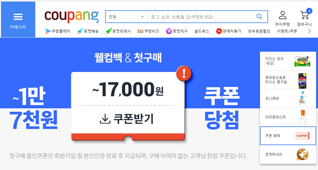 모바일 말고도 PC에서도 타인 카드로 결제가 가능합니다. 당연히 가장 먼저 쿠팡 홈페이지에 접속을 해야되겠죠?