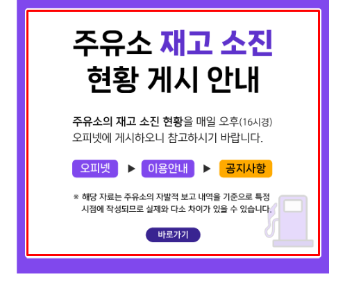 따라서 매일 오후 16시경에 주유소의 재고 소진 현황을 알려주고 있으니 방문하기 전에 공지사항을 통해 재고소진이 되었는지 알아보시길 바랍니다.