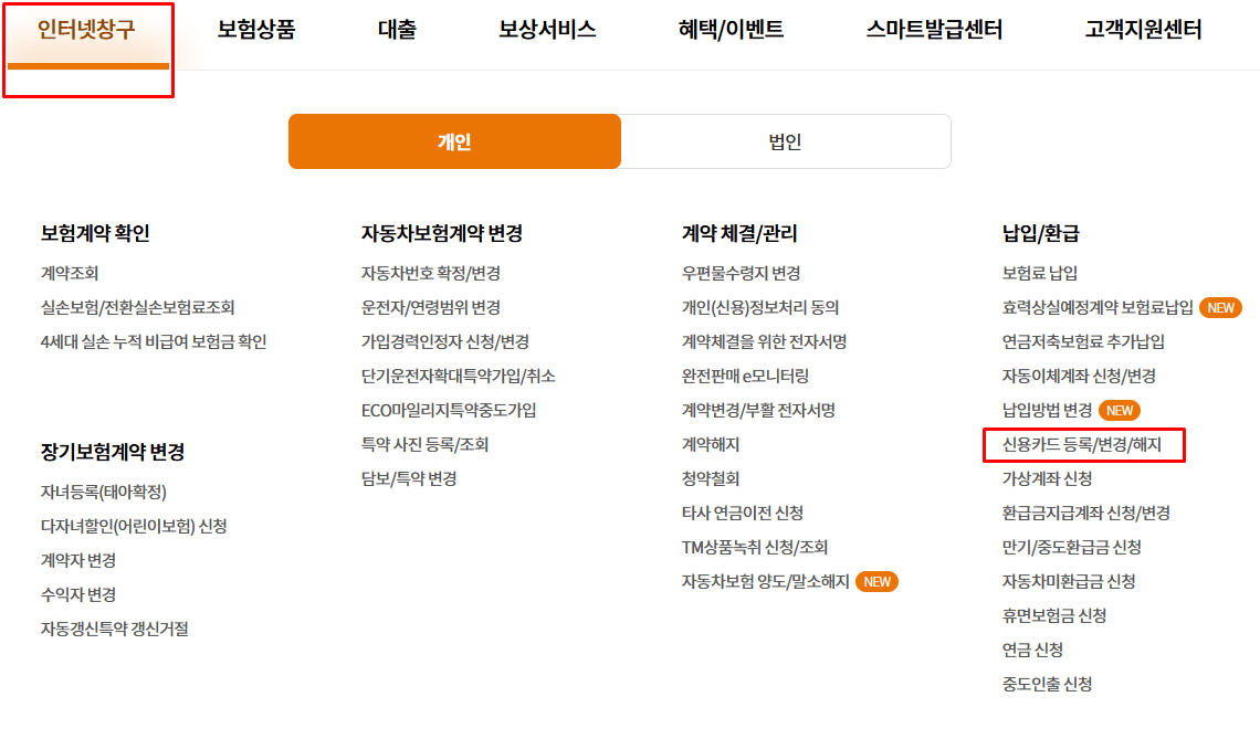 그 후 인터넷 창구 > 장기보험 계약 관리 > 신용카드 등록/변경/해지 메뉴로 이동을 해주세요.
