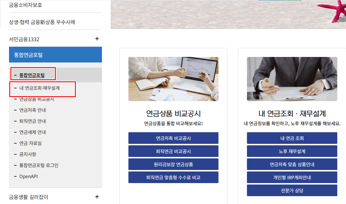 우선적으로 사이트에 접속을 하시고 메인 화면에서 금융소비자 보호 기능에서 통합연금 포털로 이동해주시면 됩니다.
