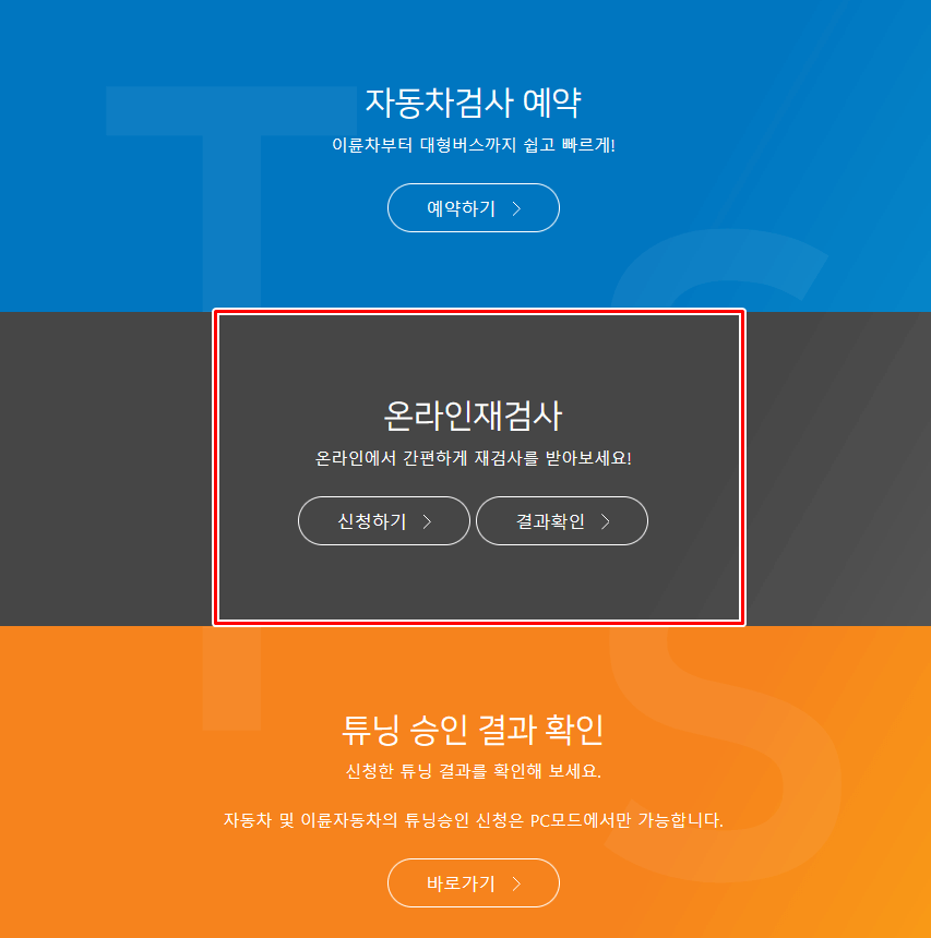 자동차 온라인 재검사 신청 및 사진첨부 등록, 변경 튜닝승인, 검사 예약확인에 해당되는 분들은 진행하시면 될 것 같아요.