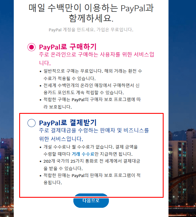 한 가지만 주의하실 점은 페이팔로 구매하기가 아닌 페이팔로 결제 받기로 회원가입을 진행해주시면 된답니다.