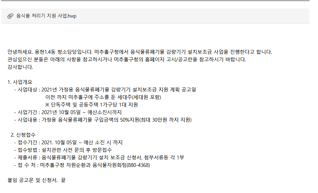 - 사업 내용 : 가정용 음식물 폐기물 감량 기기 설치 보조금 지원함