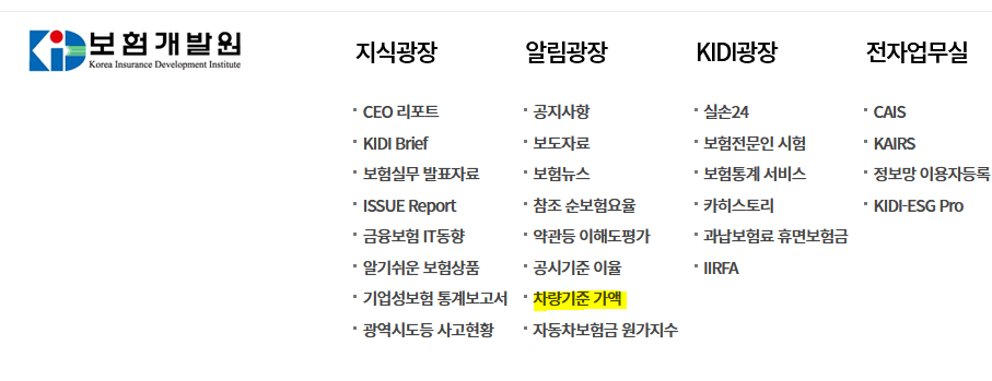 보험개발원 사이트에 방문을 하신 후 공시/조회 서비스를 통해 차량기준 가액 메뉴에서 이용을 해보실 수 있을겁니다.
