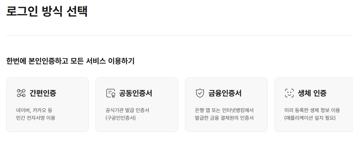 공동인증서가 있으신 분들은 공동인증서로 로그인을 하셔도 되지만, 간편인증이 사실상 더 빠르고 간편합니다.