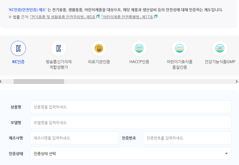 KC 인증 말고도 방송통신기자재 적합성 평가, 건강기능식품 GMP, 의료기관인증 등도 알아볼 수 있어요.