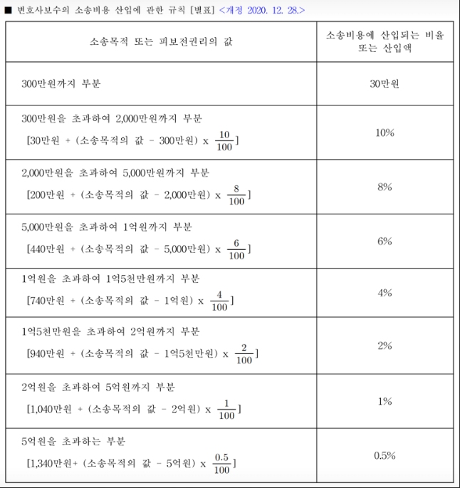 단, 이를 뛰어넘는 액수에 대해서는 인정 해주지 않기에 소가에 대한 부분, 변호사를 선임하실 대 변호사가 요구를 하는 비용 등을 잘 검토해보시길 바랍니다.