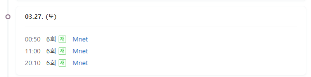 3/27 토요일에는 6회만 방송하는것을 확인하실 수 있습니다. 자신이 보기 편한시간에 시청하시면 될 것 같습니다.