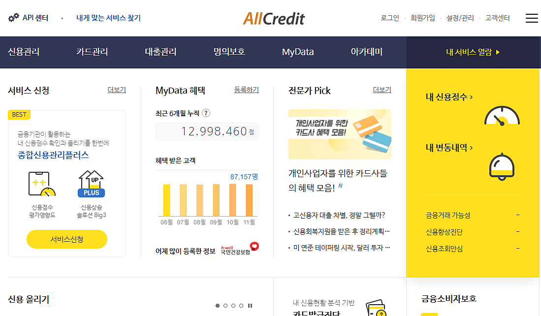 올크레딧에서 제공하고 있는 서비스 중 하나인 종합신용관리플러스 상품은 금융기관이 활용하는 종합 신용데이터를 바탕으로 하여 신용평가 영향도 기준으로 분석을 한 신용정보를 본인의 신용현황에 맞는 솔루션을 제시해주고 있습니다.