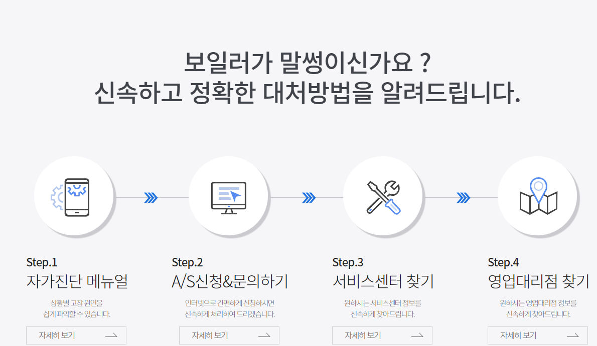 귀뚜라미 보일러 홈페이지에 접속하고 스크롤을 내리다보면 "보일러가 말썽이신가요? 신속하고 정확한 대처방법을 알려드립니다." 라는 문구와 함께 4단계에 걸친 대처방법이 기입되어 있습니다.