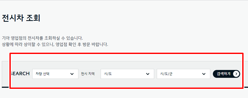 공식 사이트에 접속하게 되면 기아 전시차 조회가 뜨는데요, 전시차 차량 선택, 시/도 및 시/도/군 이라는 옵션이 나오게되는데, 본인이 거주하고 있는대로 선택해주시고 검색해주세요.