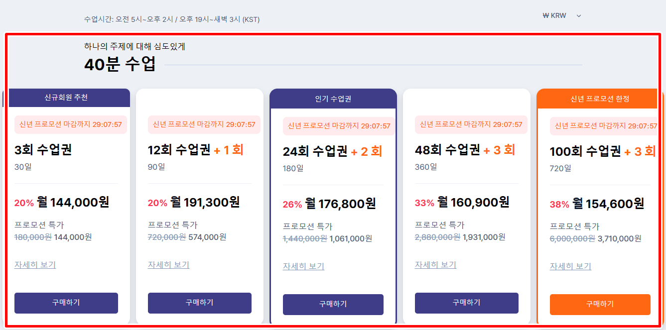 하지만 제 글을 보러 온 여러분들은 기업일 리 없기에 일반 수업권만 알아보도록 하겠습니다. 일반 수업권도 40분 수업과 20분 수업 2가지로 나뉘어지게 됩니다.