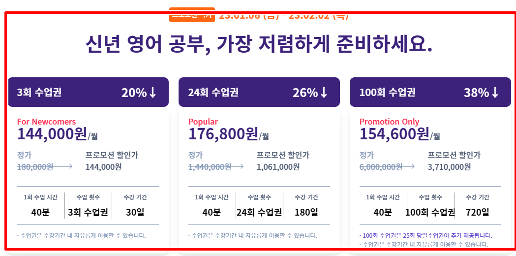 링글에서는 신규회원 일 경우 3회 수업권을 추천하고 있고, 링글에서 가장 잘 나가는 수업구너이 24회 수업권이라고 하네요.
