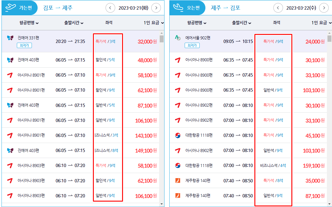1인 요금도 확인할 수 있는데요, 그 옆을 보면 남은 좌석을 아주 간단하게 알아볼 수 있습니다.