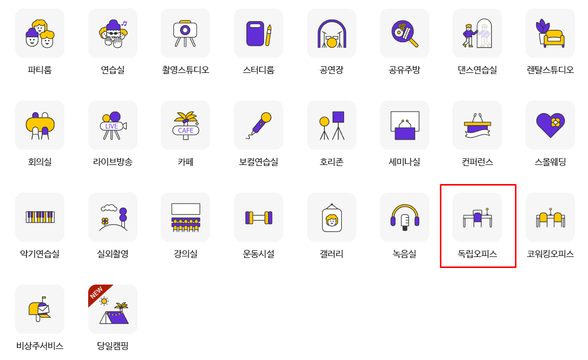 거의 모든 형태 공간을 대여할 수 있는데요, 사무실 이외에도 녹음실도 있고 춤 연습실 그리고 갤러리 카테고리도 있습니다.