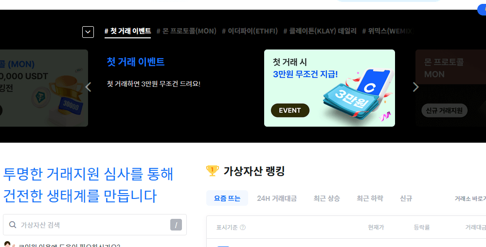 업비트와 동일하게 이더리움, 비트코인, 테더 등 다양한 암호화폐들을 거래할 수 있고, 신규 암호화폐를 빠르게 상장을 하여 투자자들의 선택권을 넓힐 수 있습니다.