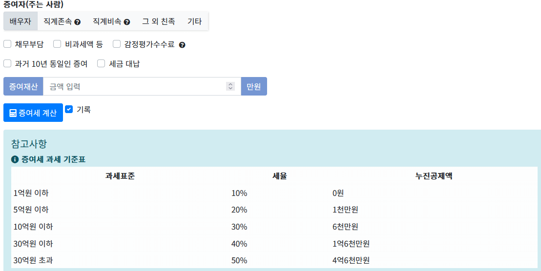 계산기를 사용하는 방법은 나에게 맞는 조건을 선택하시고, 내가 증여를 받을 재산을 입력하시면 간단하게 계산할 수 있습니다.